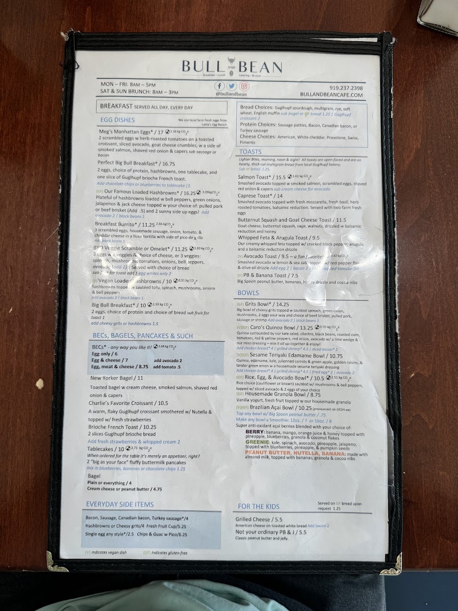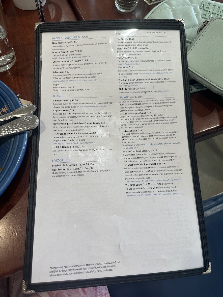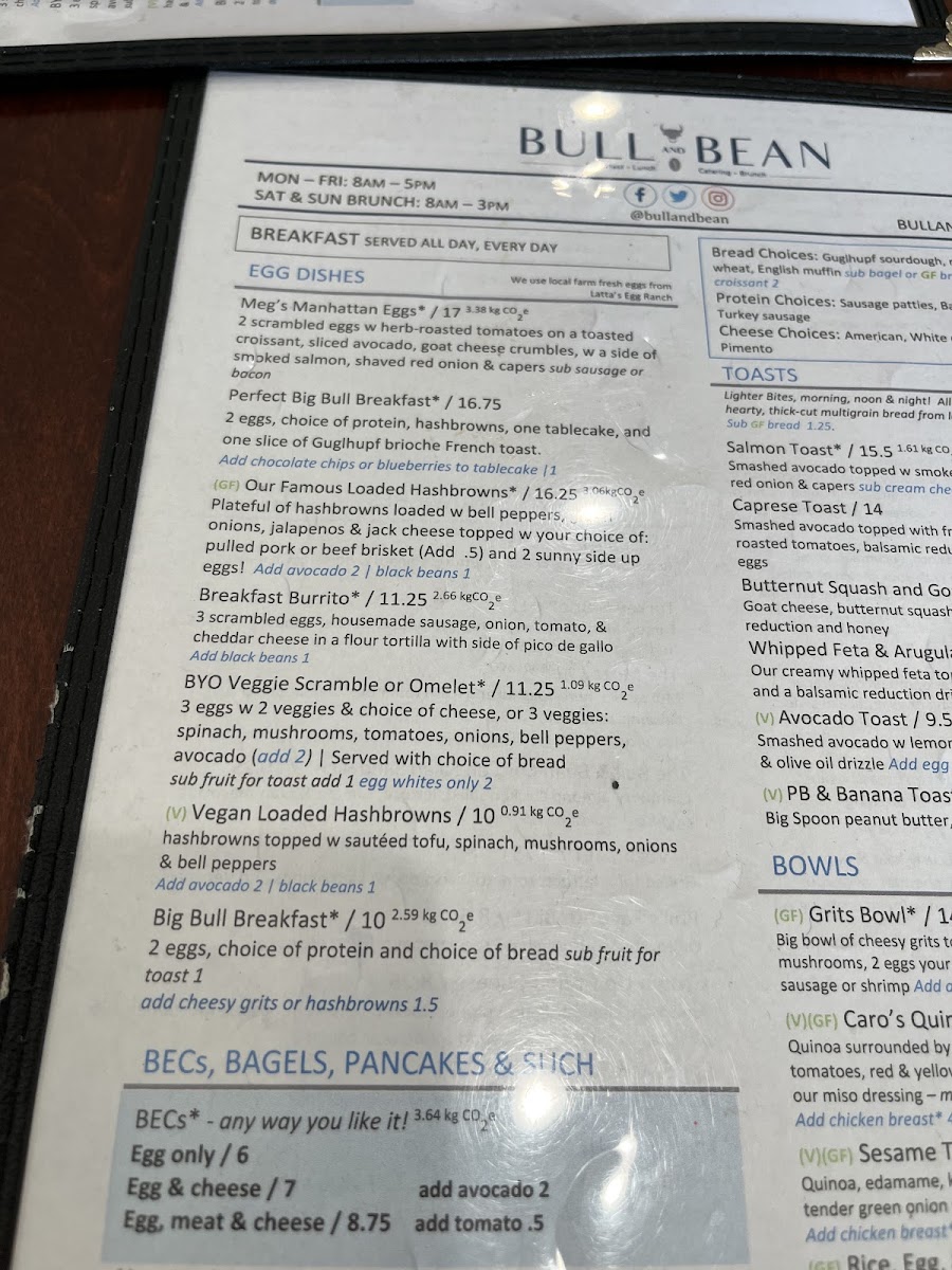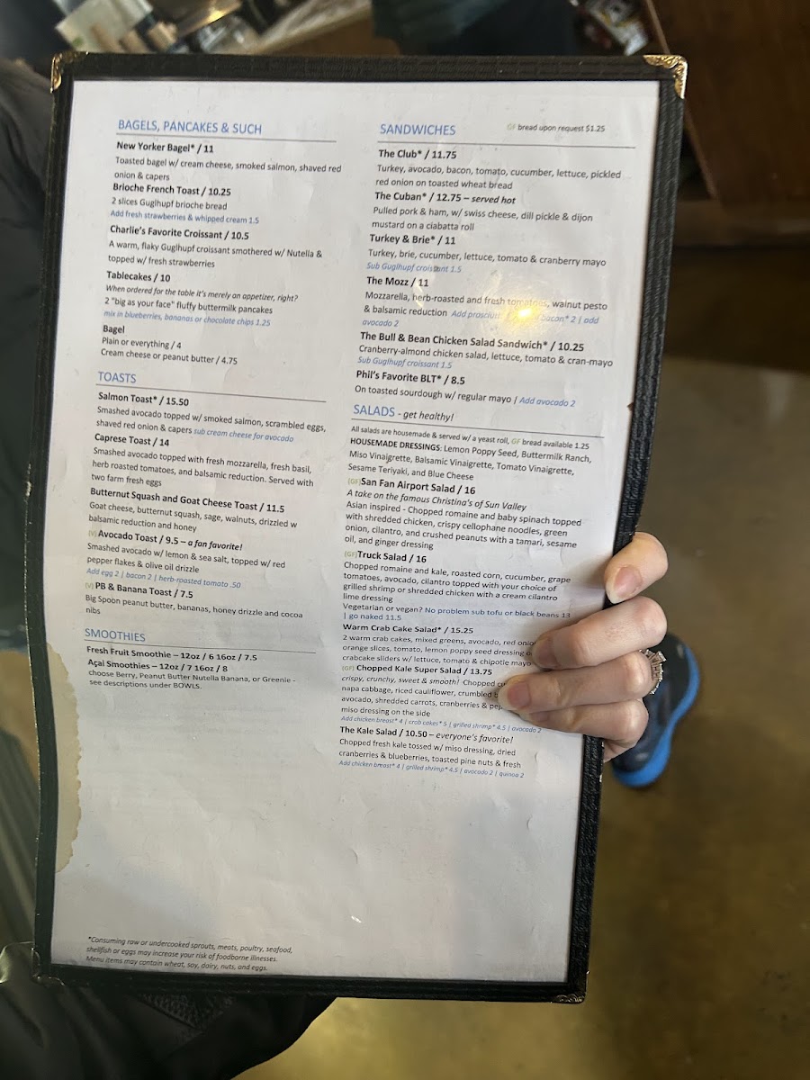2 scrambled local eggs w/herb-roasted tomatoes, on a toasted Guglhupf croissant, sliced avocado, goat cheese crumbles w/a side of smoked salmon, shaved red onion and capers. You can sub bacon or sausage for the smoked salmon.